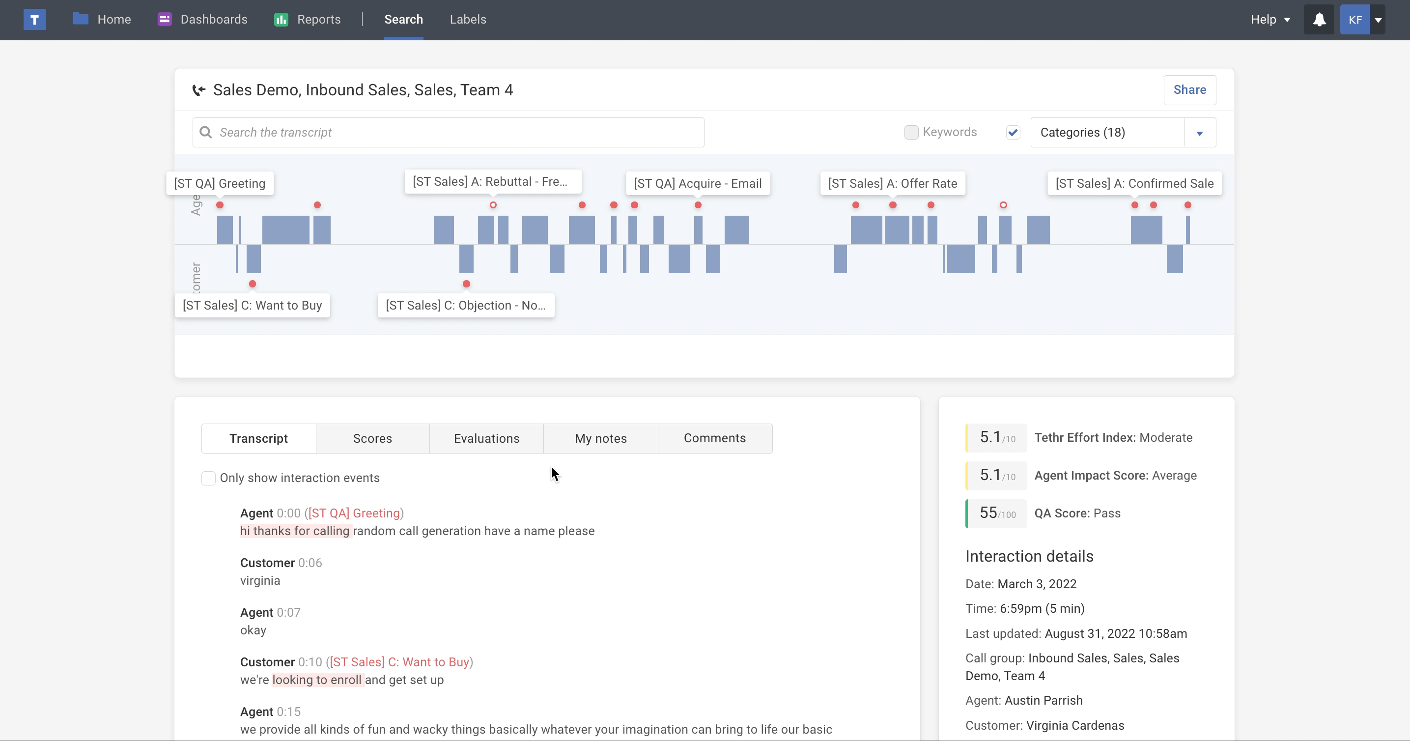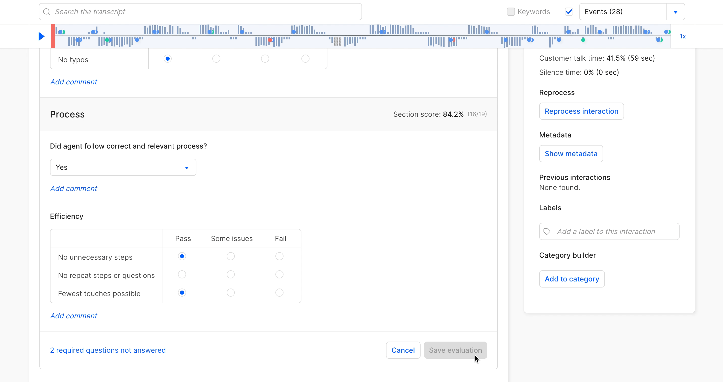 Answer each question and save the evaluation when you’re done. As soon as you save it, the completed evaluation is attached to the interaction and the results are ready to be used in a report or reviewed in a coaching session.