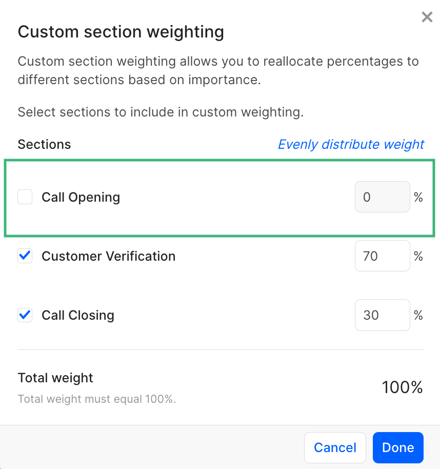 To enable custom weighting, click the Custom section weighting box in the evaluation's options and enter the percentage that each section will contribute to the evaluation's total score.