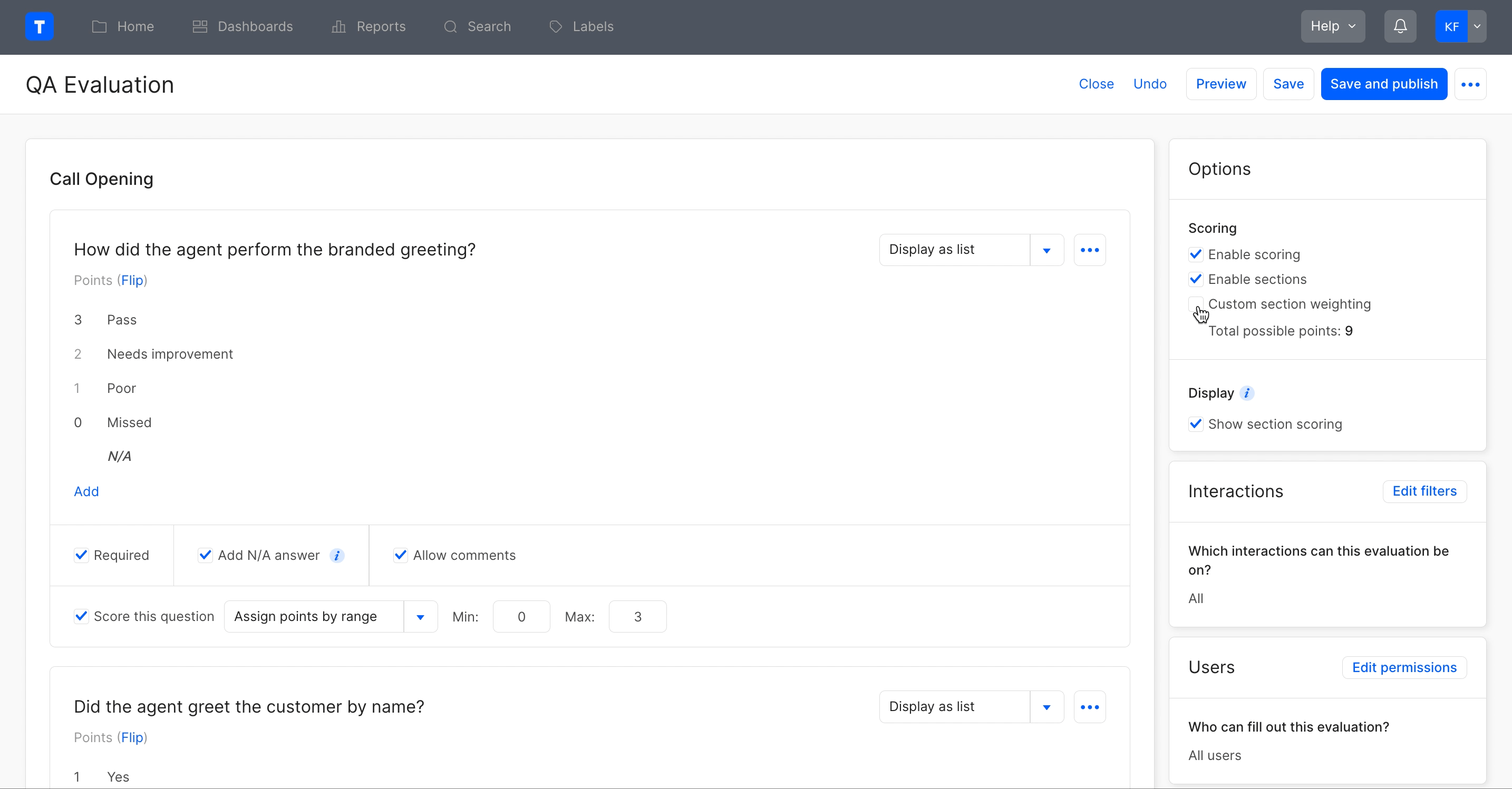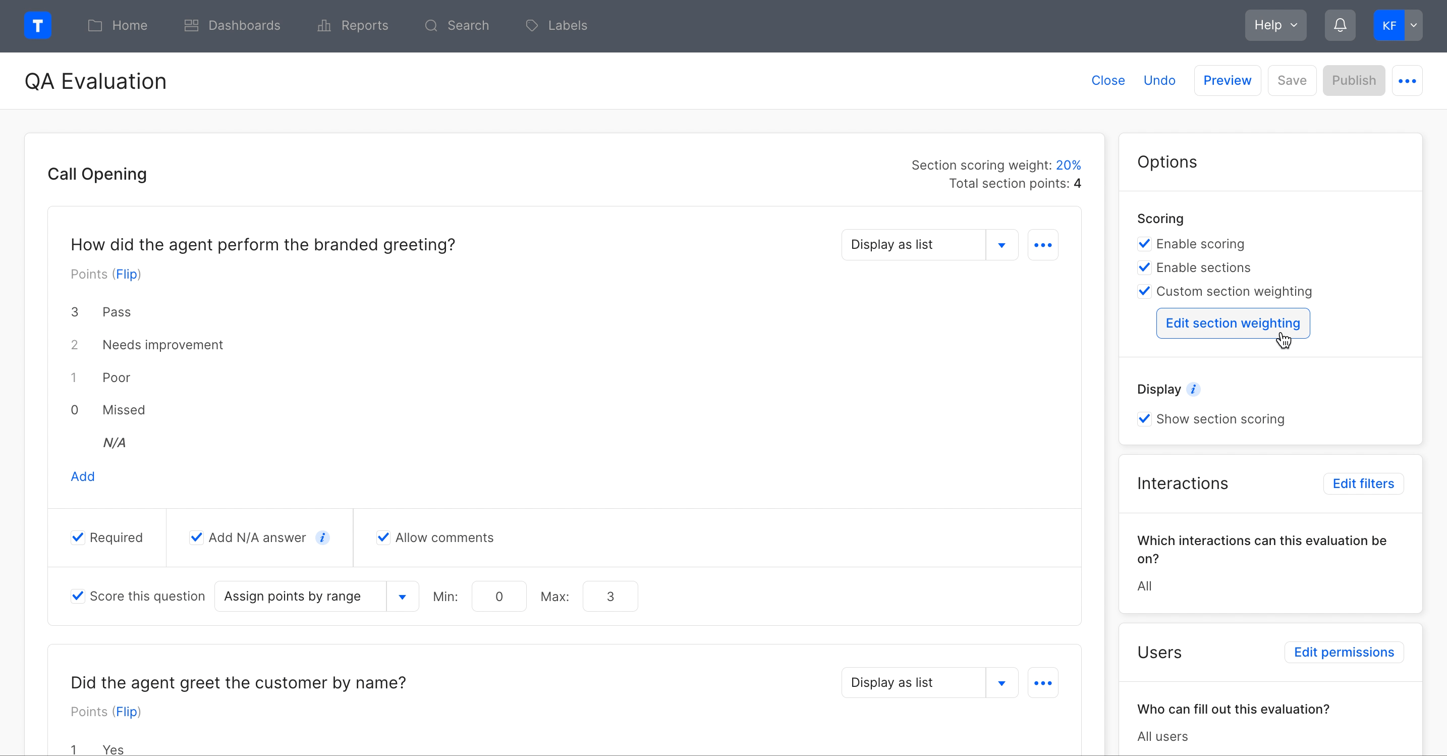 By default, the evaluation's score is calculated using the points given to each question. Custom section weighting allows users to reallocate percentages to different sections based on importance when calculating the evaluation's total score, regardless of the number of points in a section.