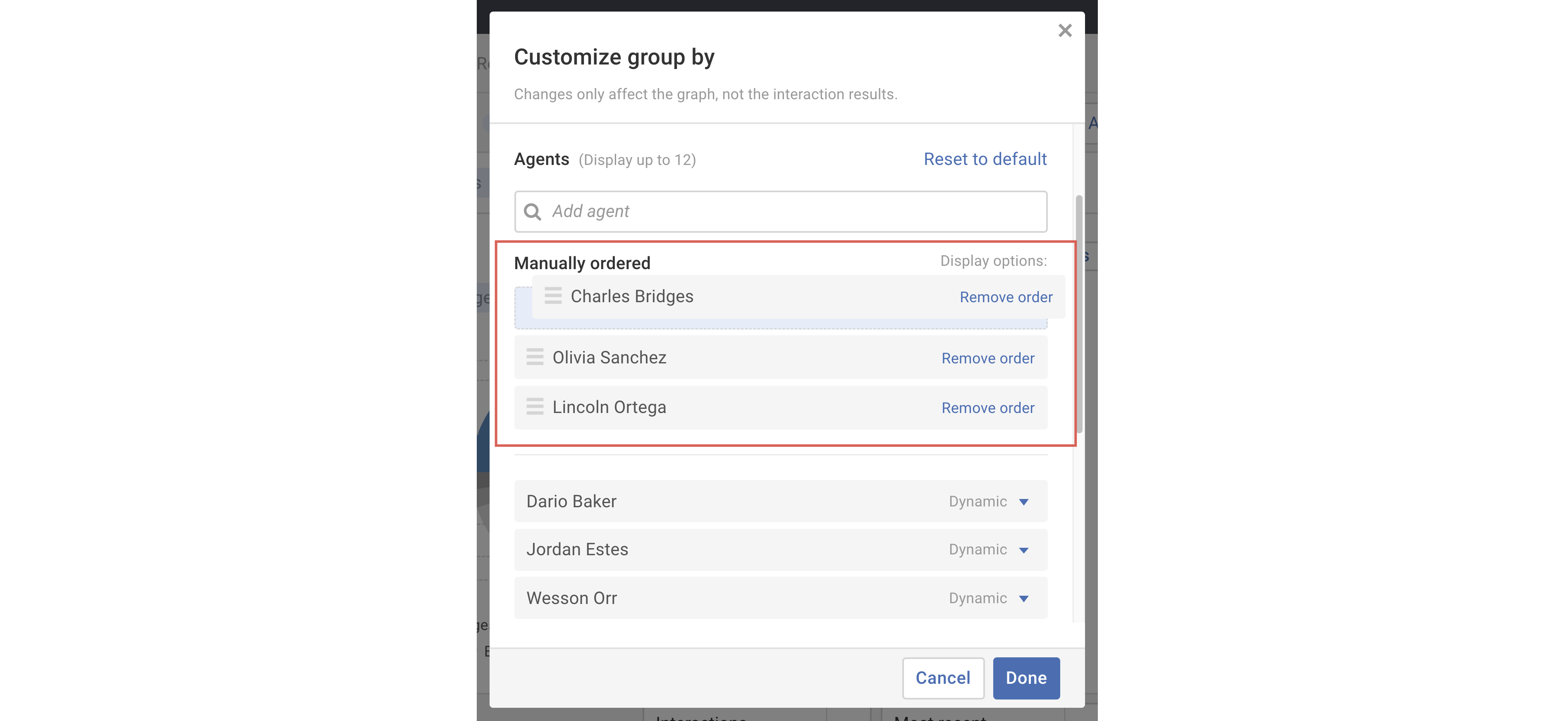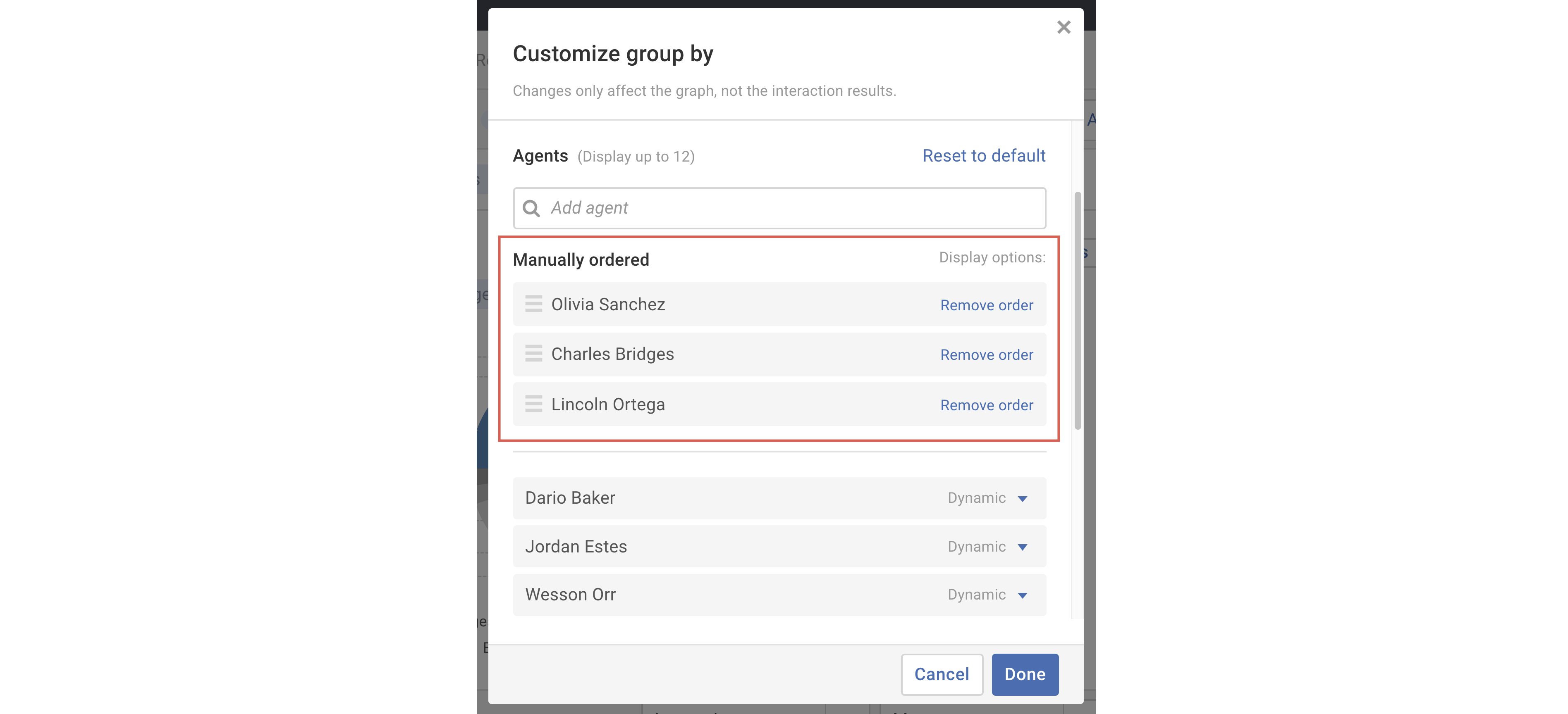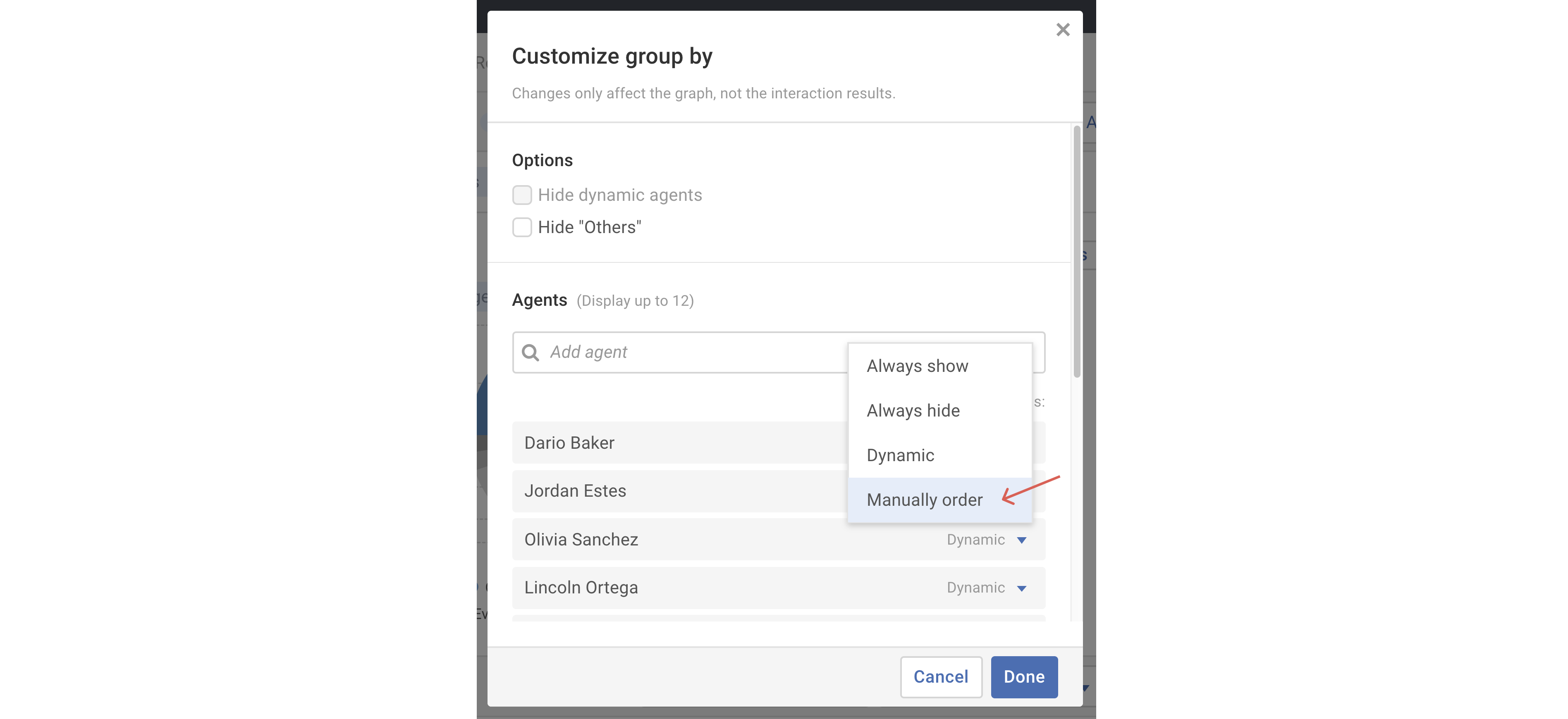 - As shown above, within the Graphing panel select the Customize link on the Group by menu. In the Customize group by pop-up, select the Display options menu of the item you'd like to manually reorder. Choose the Manually order option in the drop-down menu.