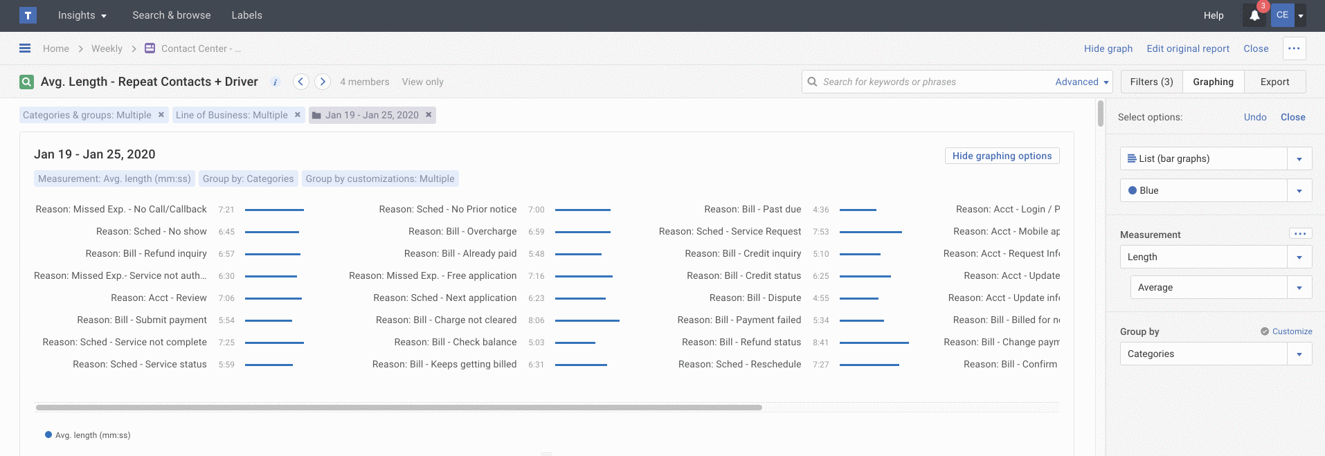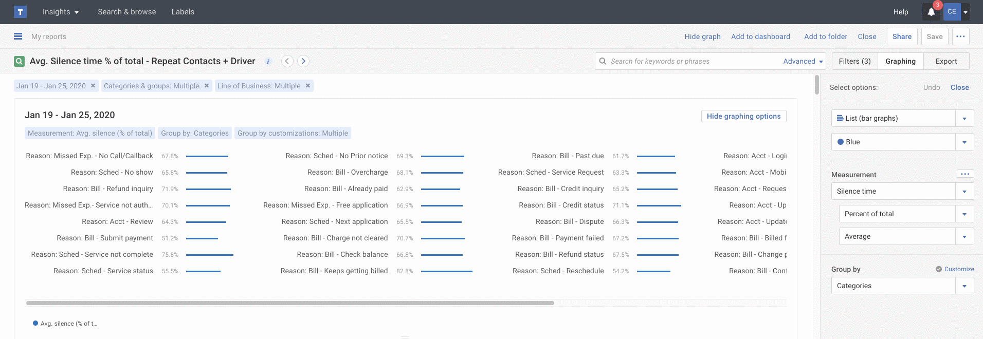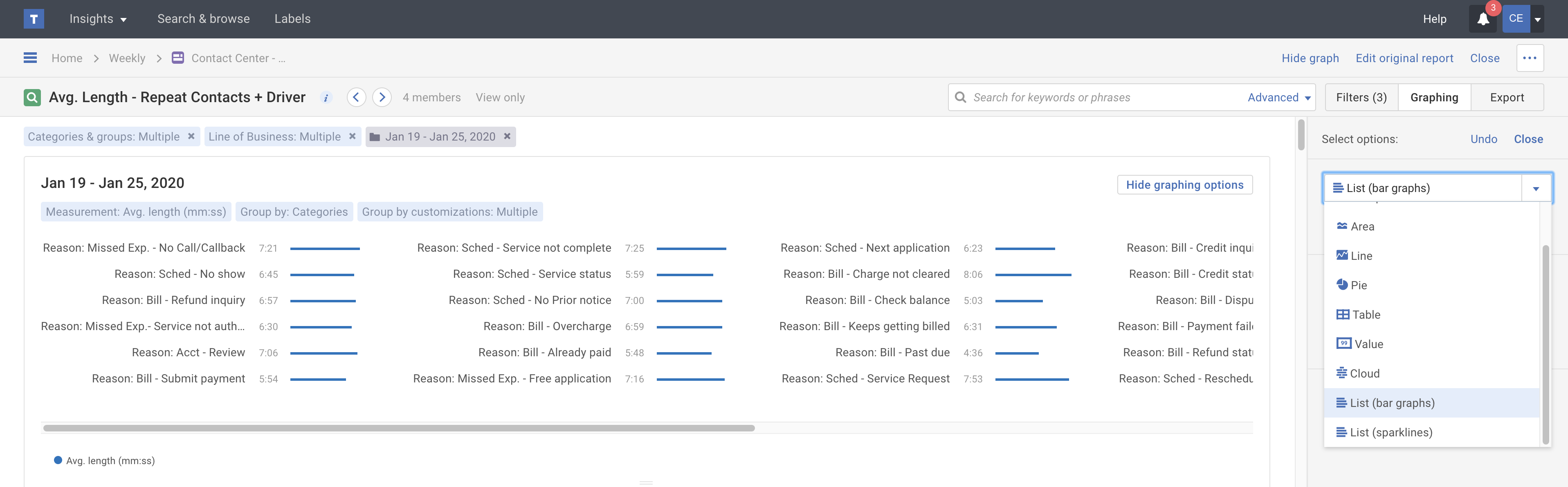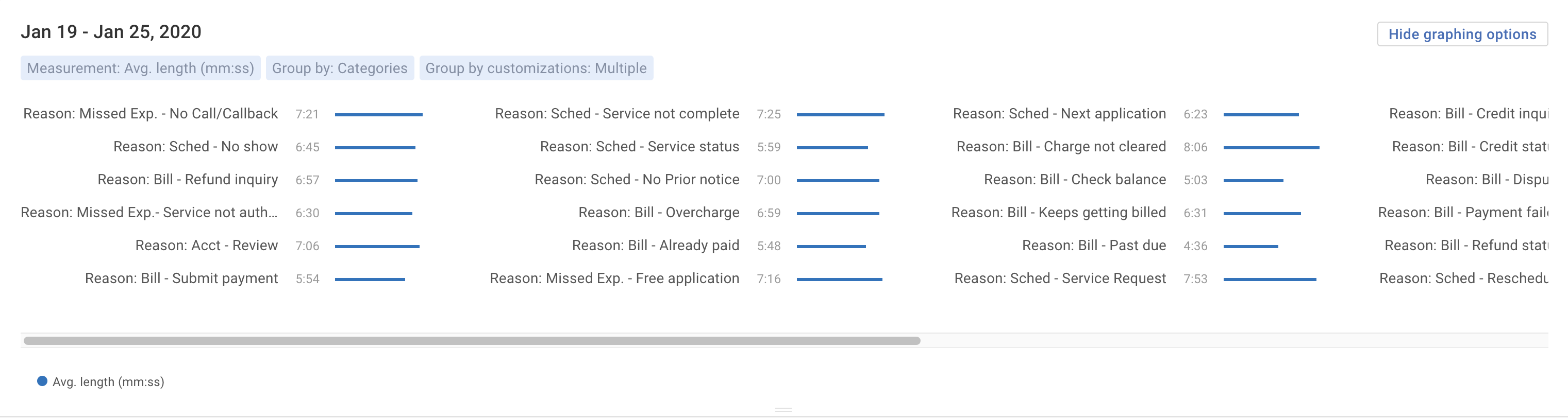Instead of struggling to read a traditional bar or grouped bar graph with 10 or more categories on it, build a horizontal list bar graph so you can emphasize an item, like Call Reason, within the overall trend. Each listed line item emphasizes category, agent or custom group (team) trends with smaller bar graphs, so you can get a sense of the relationship of one item relative to the group of items.
