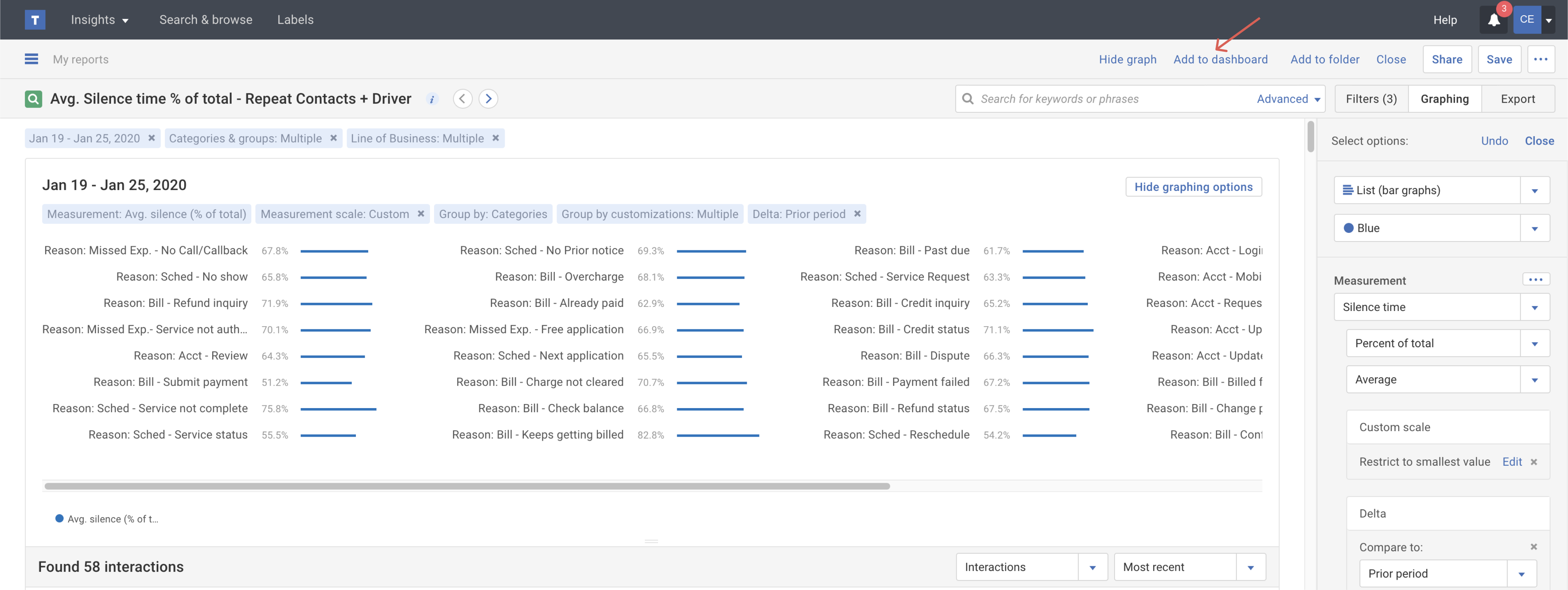 1. Be sure to add your newly created horizontal bar report to your dashboard by selecting Add to dashboard link in the top-right header of your newly saved report.