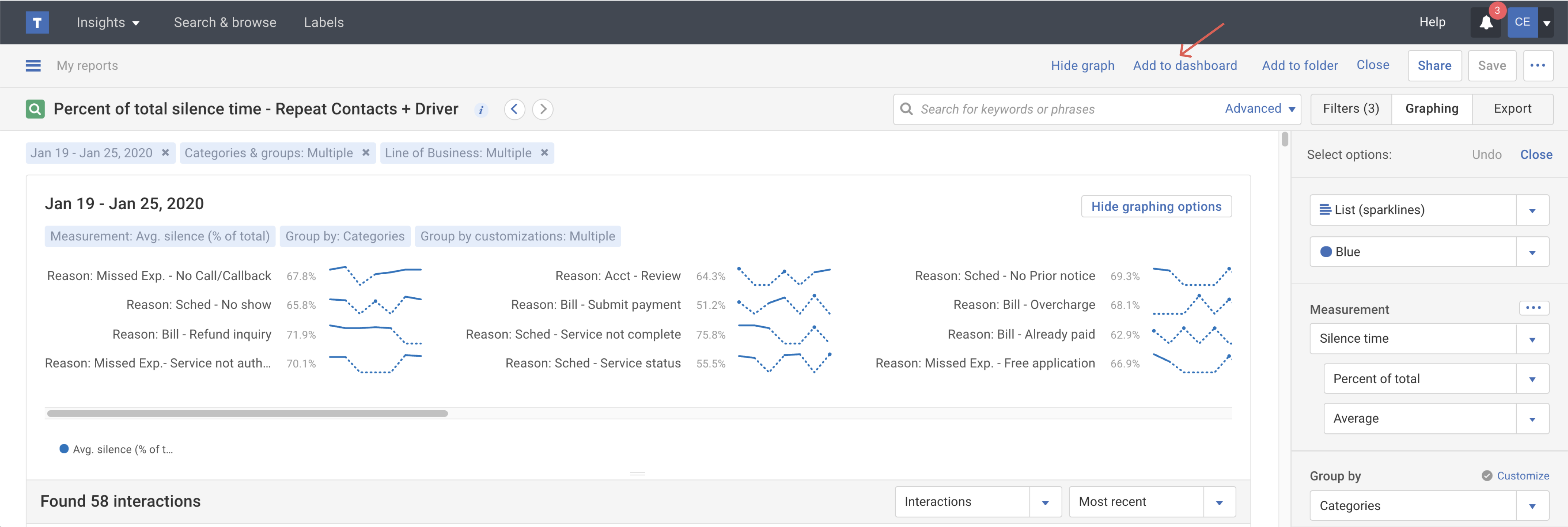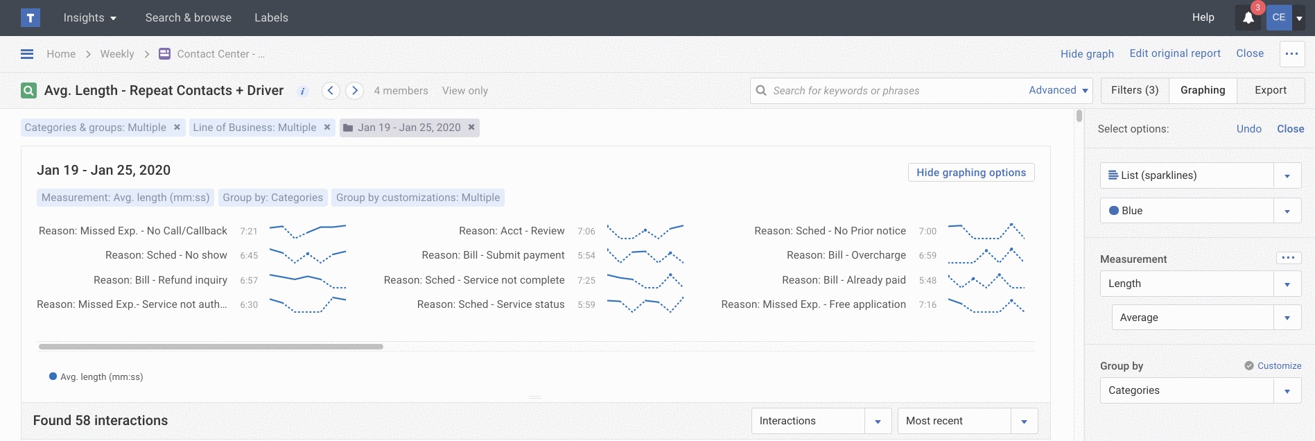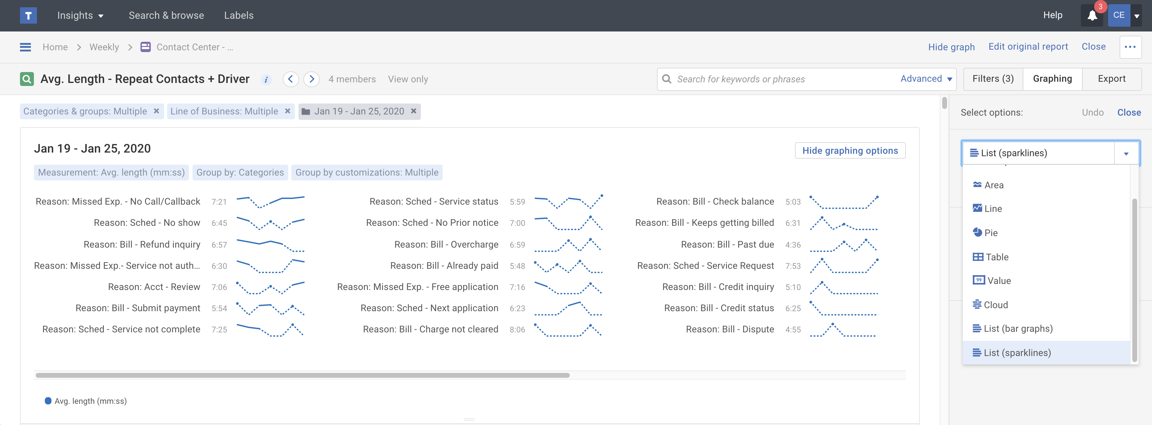 Instead of struggling to read a traditional line graph with 10 or more categories on it, build a sparkline graph so you can emphasize an item, like Call Reason, within the overall trend. Each listed line item emphasizes category, agent or custom group (team) trends with smaller line graphs, so you can get a sense of the relationship of one item relative to the group of items.