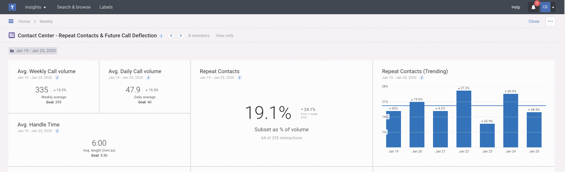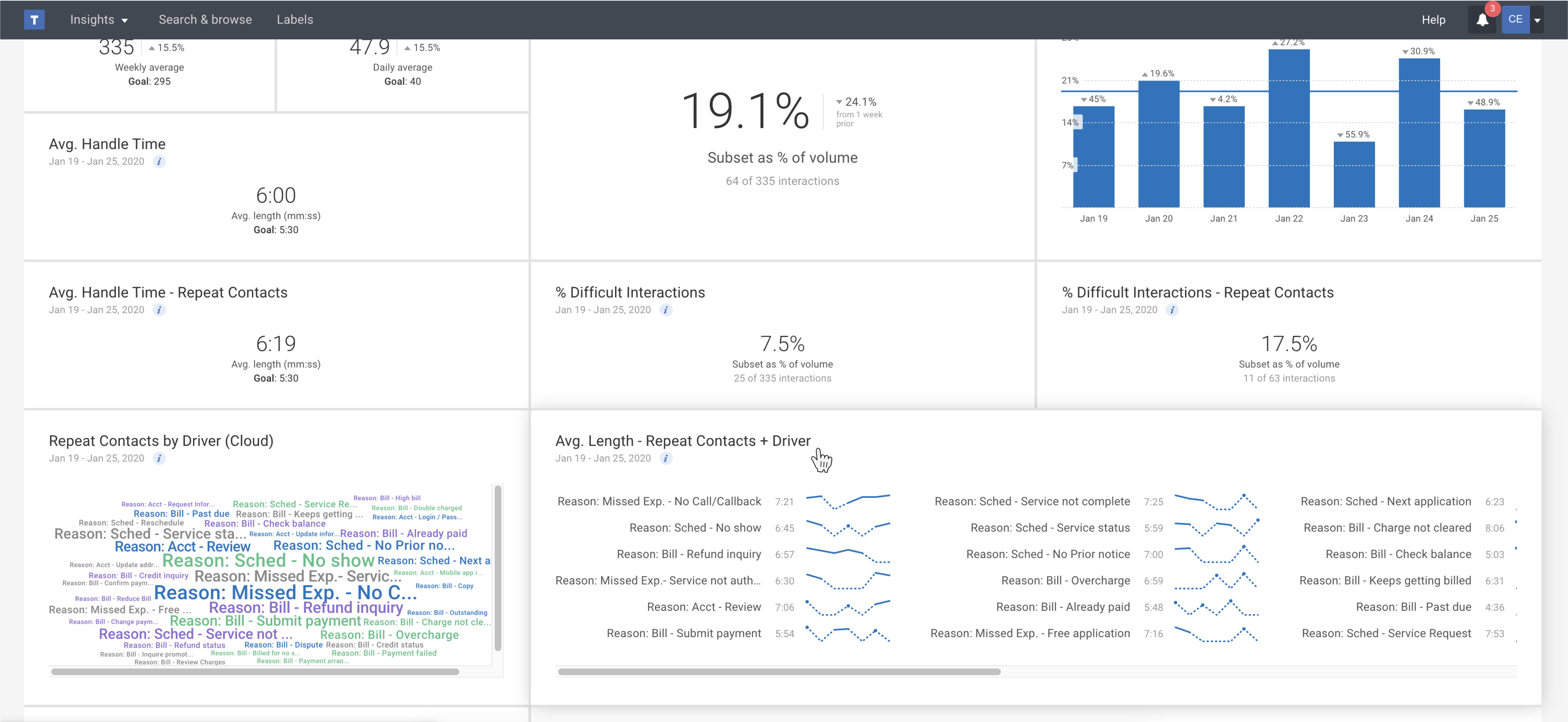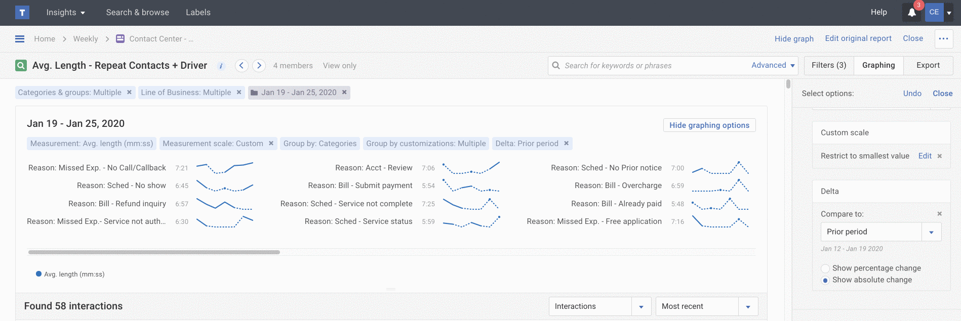 Instead of struggling to read a traditional line graph with 10 or more categories on it, build a sparkline graph so you can emphasize an item, like Call Reason, within the overall trend. Each listed line item emphasizes category, agent or custom group (team) trends with smaller line graphs, so you can get a sense of the relationship of one item relative to the group of items.