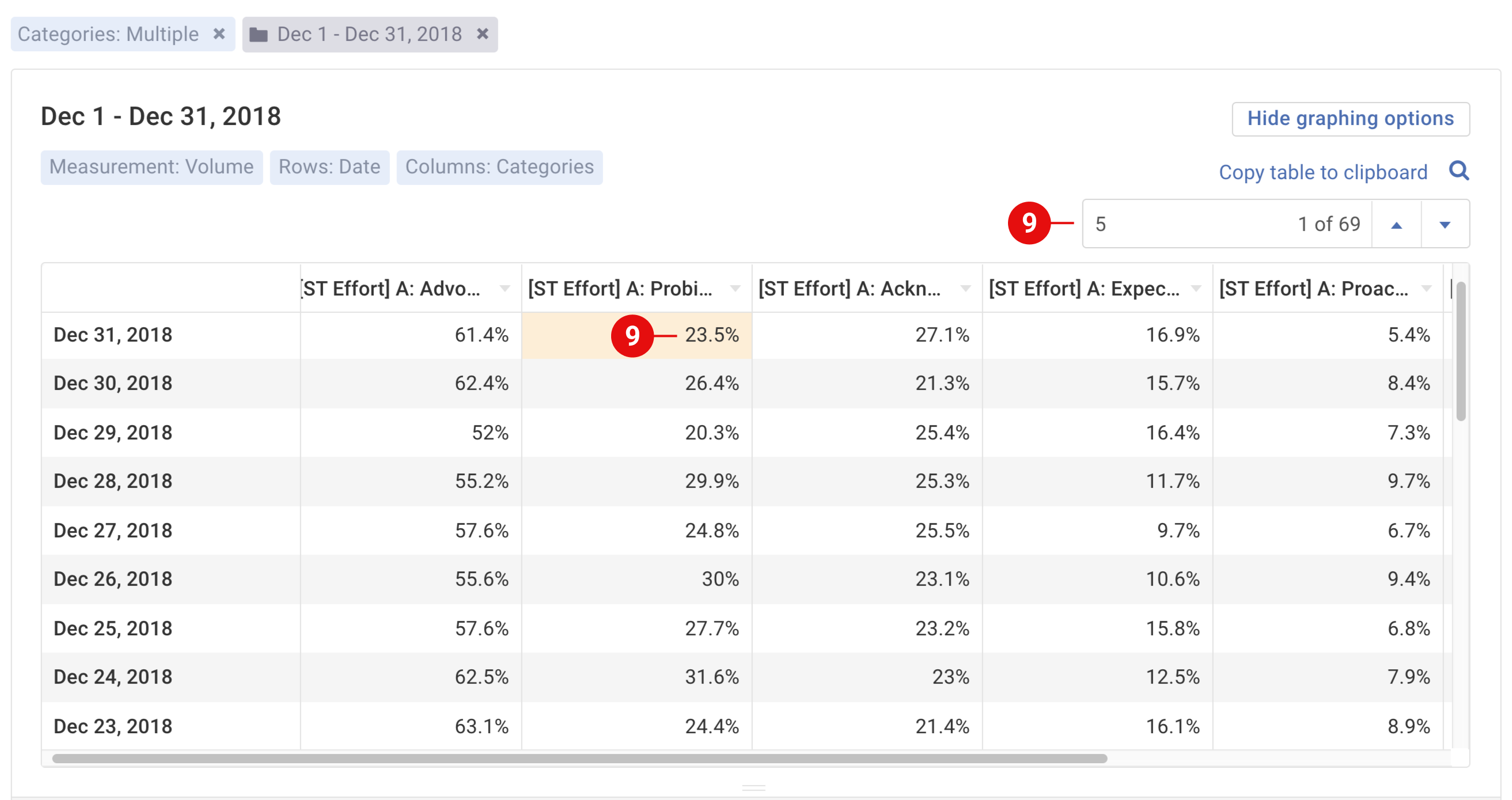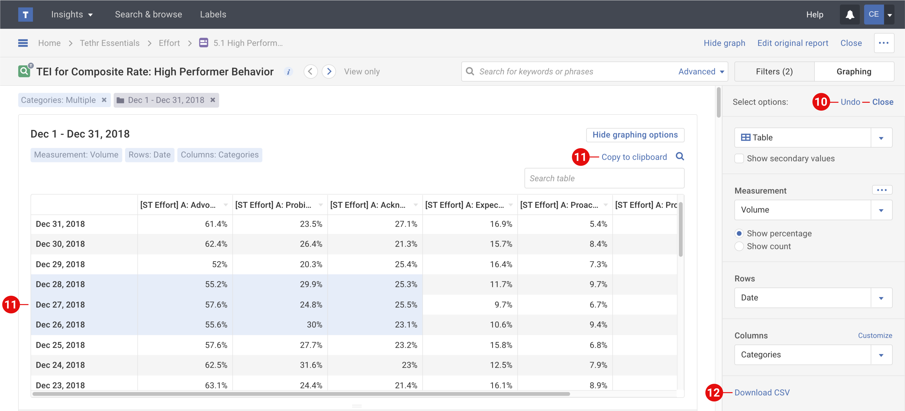 View the interactions and data on your graph as a table. Show secondary values in your table, sort the table, search the table, copy the table data to your clipboard and download the table.