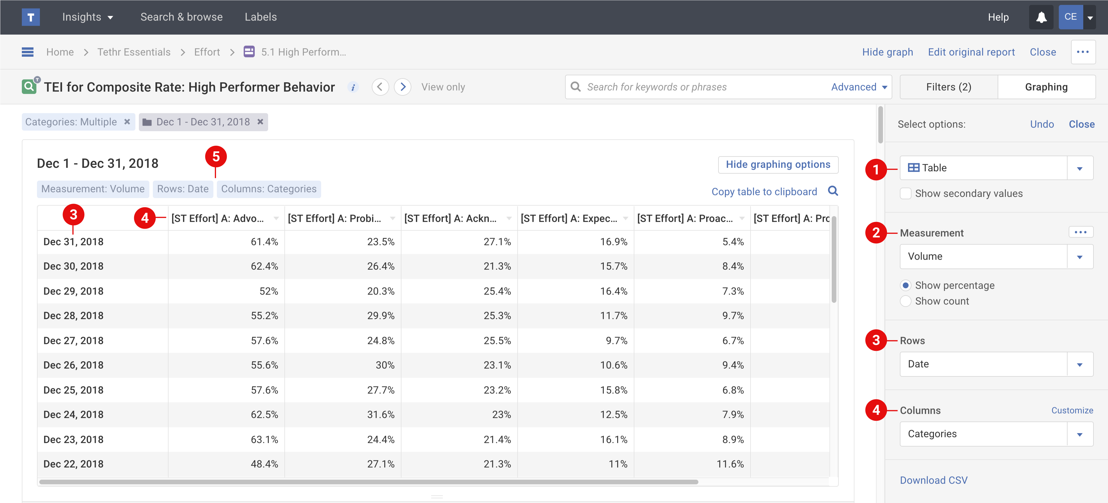 b) While your table (or any graph type) will display up to ten thousand cells in Creovai, upon CSV download the threshold increases to 100 thousand cells.