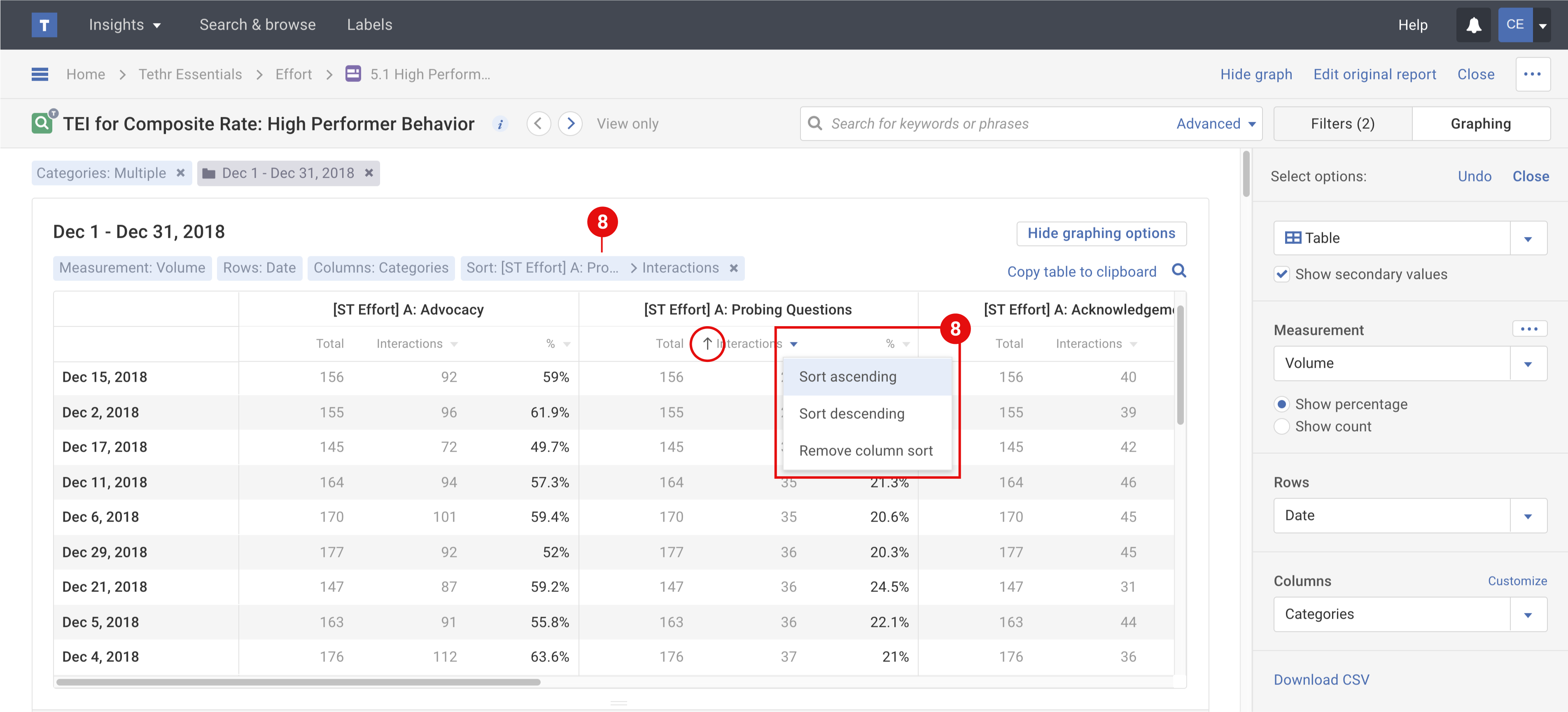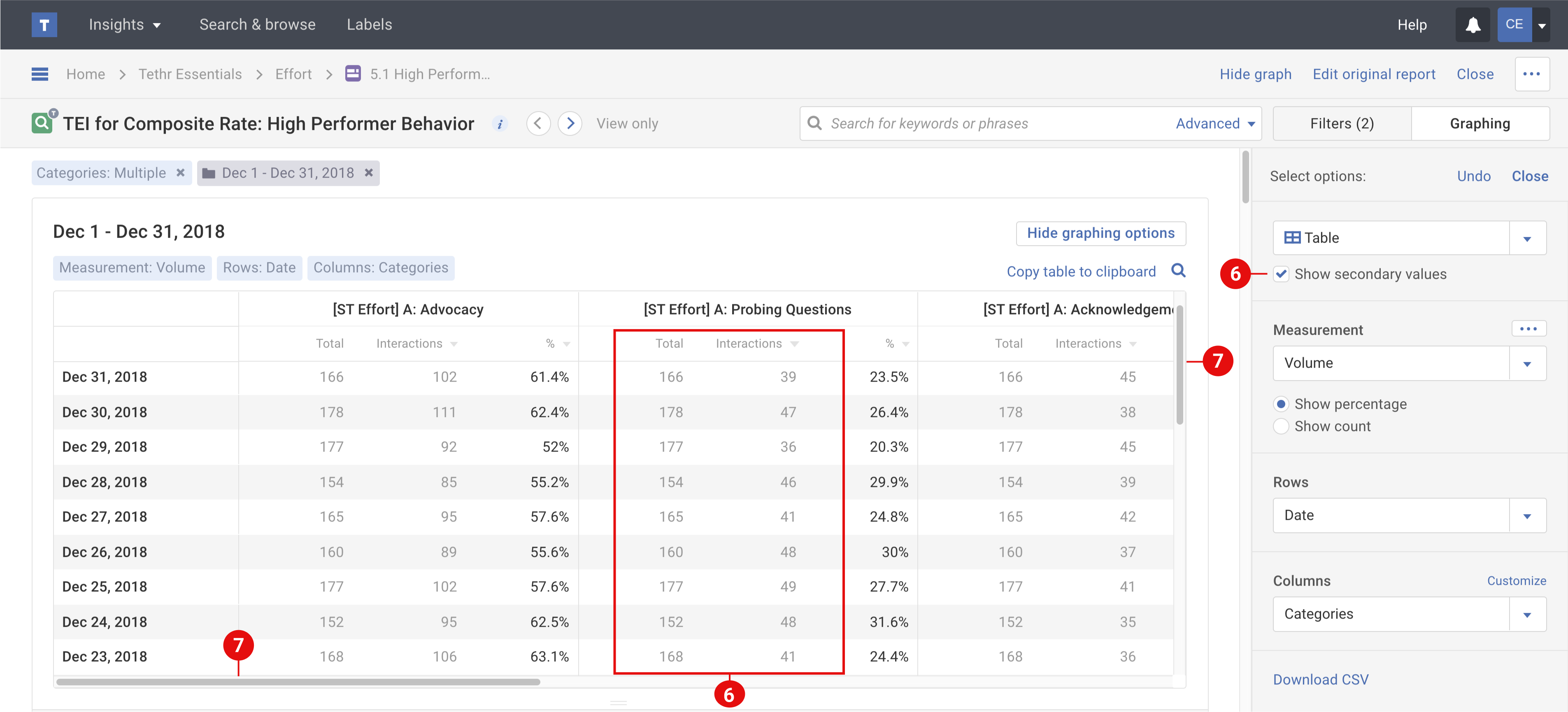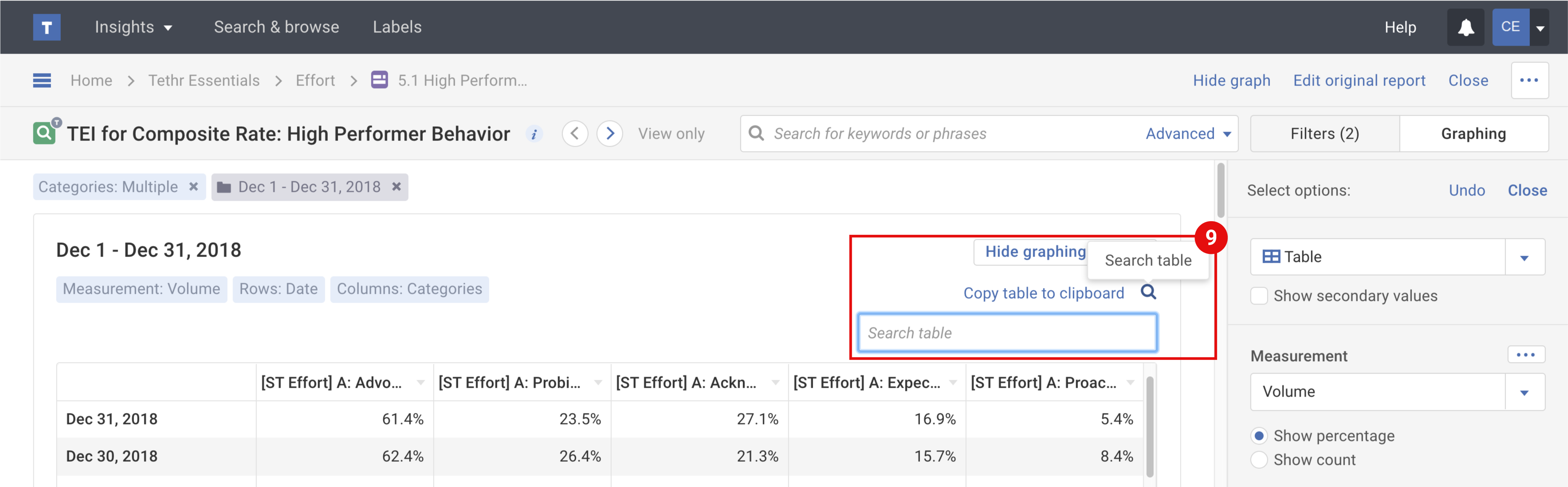 - Show secondary values: when selected this checkbox will expand your table data to show any secondary data values like interaction volume count and subset volume count or percentage volume.