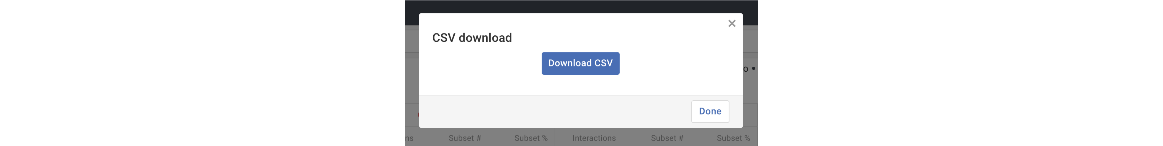 Tip: to define which columns or rows display first on your table, select Customize near your Rows or Columns menus and choose "Always show" as the display option. The CSV download will maintain any customized display settings.a) When selected, the Download CSV link will display a pop-up, like above, where you can choose to download your table as a CSV or cancel the operation and close the pop-up by selecting Done.