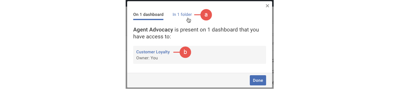 2. A pop-up will appear with a list of your dashboards and folders showing that report. The pop-up may also indicate when the report appears on other dashboards that you do not have access to.